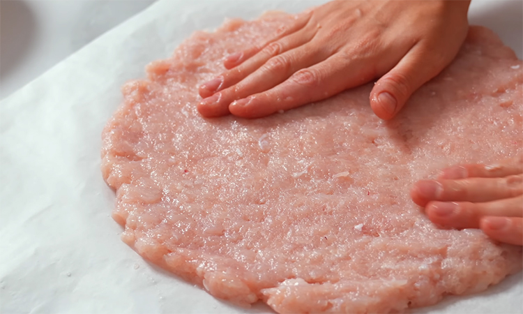 Начните с приготовления мясного основания, измельчив куриное филе в фарш и смешав его с солью и столовой ложкой муки для лучшей связки и сочности. Подготовьте соус, соединив томатную пасту с измельченным чесноком, базиликом и орегано для создания пряного аромата. Нарежьте шампиньоны пластинками, помидор небольшими кубиками, а лук тонкими четвертькольцами.