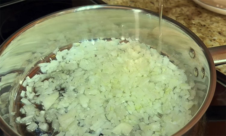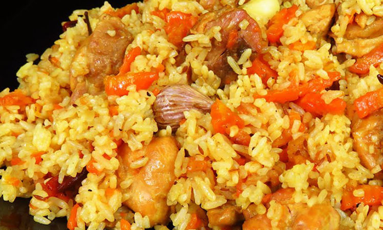 Залейте содержимое сковороды горячим кипятком в пропорции один к одному и три четверти, еще раз перемешайте и накройте крышкой. Для идеального результата поместите сковороду в разогретую до двухсот градусов духовку на восемнадцать или двадцать минут, либо томите на самом минимальном огне на плите до полного выкипания воды.