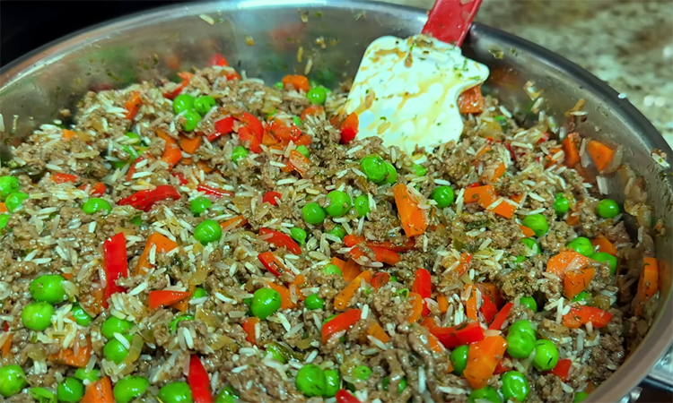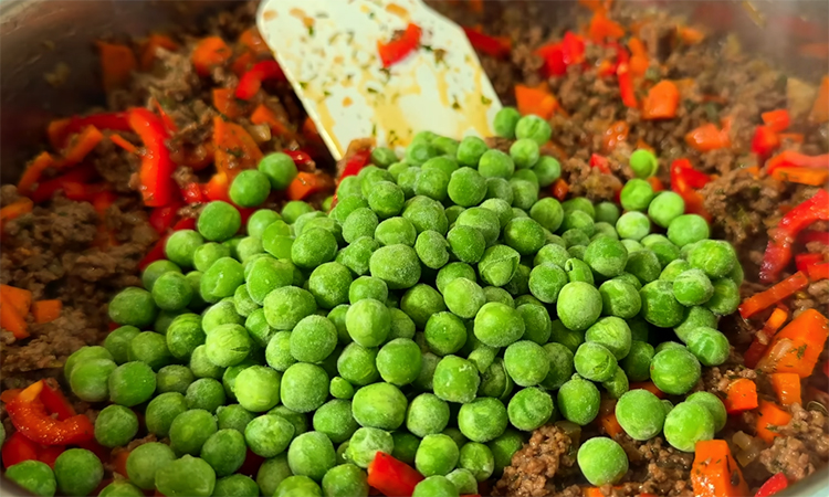 Всыпьте все сушеные специи (паприку, орегано, укроп, петрушку), посолите, поперчите и добавьте натертый на мелкой тёрке зубчик чеснока. Когда фарш потемнеет и хорошо обжарится, добавьте кусочек сливочного масла, болгарский перец и стакан зеленого горошка. Тщательно промойте рис под холодной водой до полной прозрачности, всыпьте его в сковороду к мясу и овощам, перемешайте и прогрейте несколько минут, чтобы крупа впитала жир.