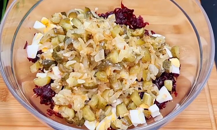 Соленые огурцы редко используют в жарке, хотя при тепловой обработке они становятся мягче, насыщеннее и усиливают общий вкус блюда. В сочетании со свеклой, яйцами и простой заправкой этот салат получается ярким, сбалансированным и готовится быстрее классических слоёных салатов.