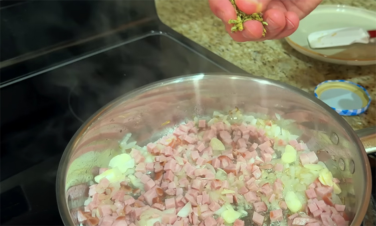 Отварите макароны в большом количестве подсоленной воды до состояния альденте, следуя инструкции на упаковке, при этом обязательно сохраните стакан воды из-под варки. Параллельно на разогретой сковороде с растительным маслом обжарьте мелко нарезанный лук до мягкости, затем добавьте к нему измельченную ветчину. Нарежьте чеснок тонкими ломтиками и отправьте его к обжаренным ингредиентам вместе с орегано и перцем, позволяя специям раскрыть свой аромат в горячем масле.