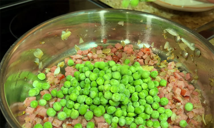 В отдельной емкости соедините яйца, сливки, тертый сыр, соль и перец, тщательно взбивая массу до получения однородной основы для будущего соуса. Добавьте на сковороду замороженный горошек, прогрейте его в течение минуты, после чего выложите отваренную пасту и тщательно перемешайте все компоненты.