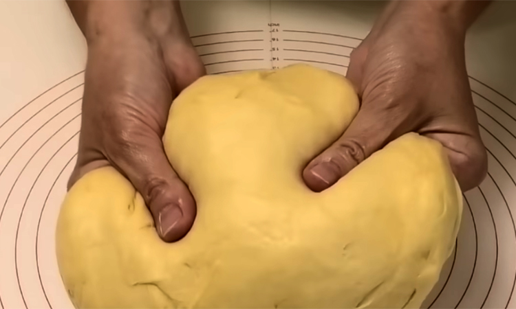 Постепенно всыпайте оставшуюся муку, сначала замешивая ложкой, а затем переходите на ручной замес, добавив остатки масла для эластичности. Тщательно вымешивайте тесто на столе в течение 5–10 минут до гладкости, при необходимости слегка отбивая его для улучшения структуры, затем уберите в миску на расстойку примерно на 40–60 минут. Подготовьте начинку непосредственно перед формовкой: разомните повидло комнатной температуры и аккуратно смешайте его с замороженной смородиной, не допуская размораживания ягод.