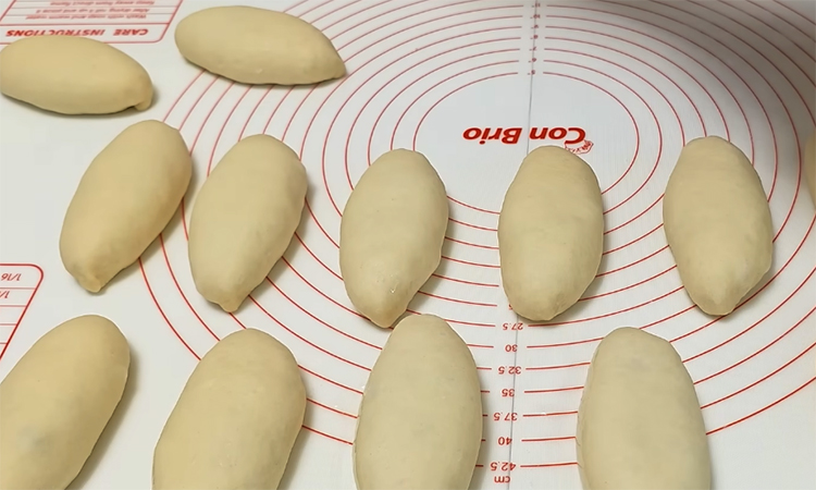Разделите подошедшее тесто на 15 равных частей, сформируйте из них гладкие шарики и дайте им отдохнуть под пленкой в течение 10 минут. Раскатайте каждый шарик в лепешку, выложите по центру чайную ложку начинки и плотно защипните края, формируя аккуратный пирожок в форме лодочки. Смажьте один бок каждого изделия растительным маслом и плотно уложите их на противень с пергаментом, после чего оставьте на 20 минут для окончательной расстойки.