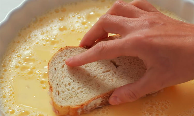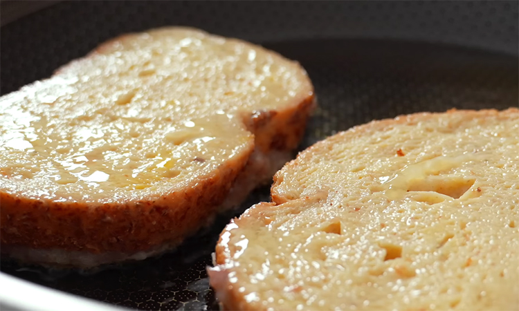 Обмакните каждый бутерброд в яичную смесь фаршем вниз и дайте им немного полежать, чтобы хлеб хорошо пропитался жидкостью. Для обжарки выложите бутерброды на разогретую сковороду с маслом сначала фаршем вниз и готовьте на огне ниже среднего около восьми минут. Переверните и подрумяньте хлебную сторону в течение пары минут до золотистого цвета.