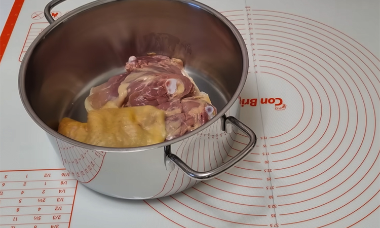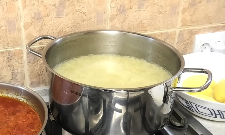 Положите мясо в кастрюлю, залейте холодной водой и поставьте на огонь, тщательно снимая пену после закипания. Варите наваристый бульон на минимальном огне около сорока минут, добавив соль. Промойте пшено несколько раз и залейте его кипятком на время, чтобы ушла горечь, затем слейте воду и отправьте крупу в бульон к мясу. Следом в кастрюлю положите целые очищенные картофелины и варите их до полной мягкости.