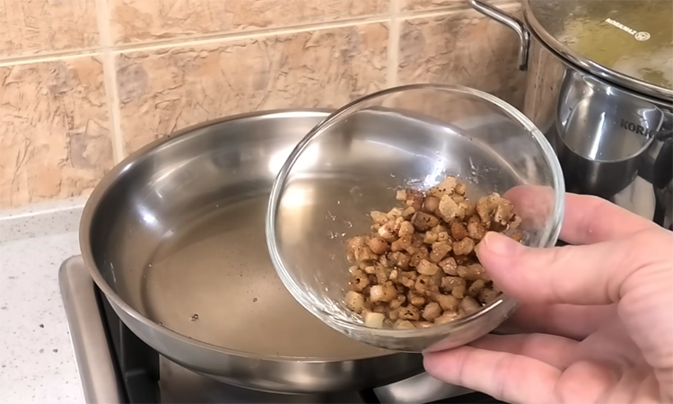 Для зажарки нарежьте свежее сало мелкими кубиками, вытопите жир на сковороде, обжарьте на нем кусочки мяса и уберите шкварки. На оставшемся жире спассеруйте мелко нарезанный лук и натертую на мелкой терке морковь до мягкости, добавьте томатную пасту и немного бульона, протушив соус пять минут. Измельчите свежую капусту на терке, а квашеную мелко порубите ножом.