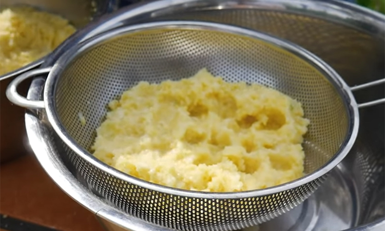 Подготовленный картофель натрите на крупной терке, чтобы сохранить структуру и не превратить массу в кашу. Переложите картошку в миску, всыпьте одну чайную ложку соли и перемешайте для выделения сока. Через пару минут сильно отожмите картофельную массу руками, сливая всю жидкость в отдельную чашку.