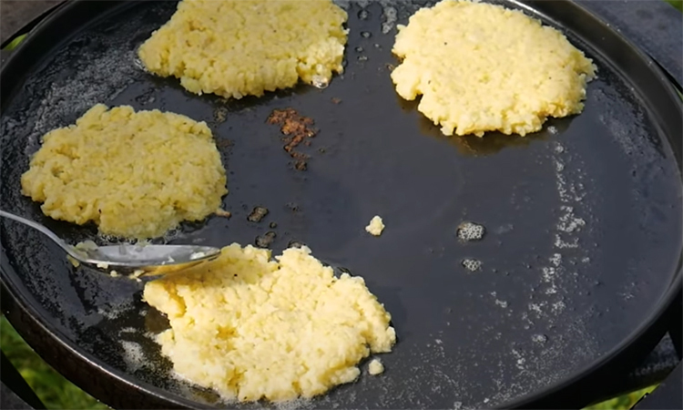 Выложите порции теста столовой ложкой и немного прижмите их сверху, чтобы лепешки получились тонкими. Жарьте драники с двух сторон до появления золотистого цвета и хрустящих краев. Готовые деруны снимите со сковороды и обязательно уберите со дна пригоревшие крошки перед следующей закладкой.