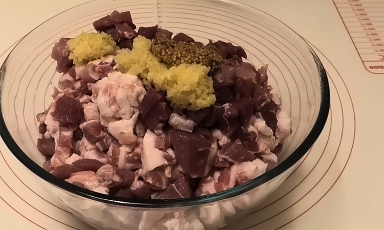 Половину подготовленной свинины пропустите через мясорубку с самой крупной решеткой, а оставшееся мясо и жирные части нарежьте мелким кубиком ножом. Смешайте оба вида мяса в большой емкости, добавьте пропущенный через пресс чеснок, зернистую горчицу, соль и оба вида перца. Влейте ледяную воду порциями, тщательно массируя и вымешивая фарш руками, пока влага полностью не впитается и масса не станет однородной.