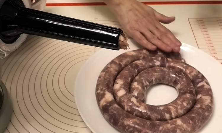 Накройте емкость пленкой и оставьте мариноваться при комнатной температуре на три часа или уберите в холодильник на всю ночь. Натуральную оболочку промойте от соли изнутри и снаружи, затем наденьте ее на специальную насадку мясорубки для колбас. Наполните кишку мясной массой, следя за тем, чтобы плотность была умеренной, и завяжите концы ниткой или узелком, формируя аккуратные кольца. Проткните колбасу тонкой иглой в нескольких местах с обеих сторон, чтобы выходил лишний воздух и пар во время термической обработки.