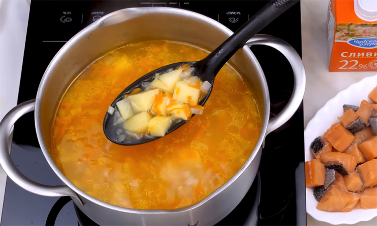 Рыбное филе аккуратно отделите от костей, разберите на средние кусочки и также отправьте обратно в кастрюлю. Влейте в суп сливки, добавьте черный перец, доведите до кипения и сразу снимите с огня. Дайте готовой ухе настояться под крышкой пятнадцать минут перед тем, как разливать по тарелкам.
