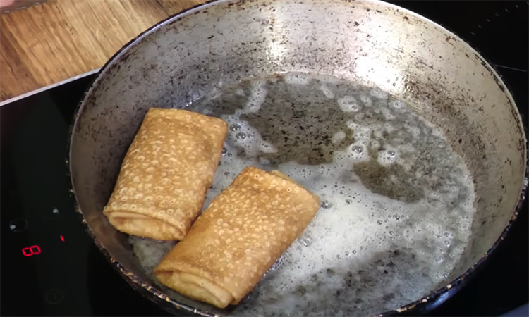 Разложите готовые изделия на подносе в один слой и отправьте в морозильную камеру до полного затвердевания. Замороженные блинчики распределите по пакетам, выпустив лишний воздух, и храните в морозилке. Перед употреблением разморозьте необходимое количество блинов в микроволновой печи или в холодильнике, после чего обжарьте на смеси сливочного и растительного масел до хрустящей корочки.
