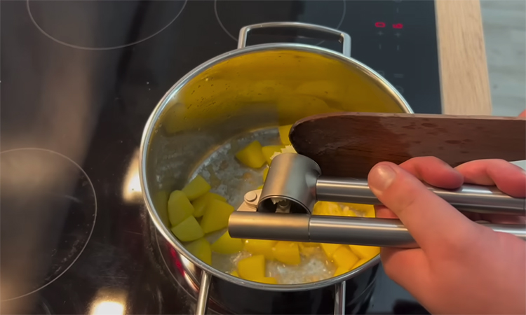 В оставшийся кипящий бульон отправьте двадцать пять зубчиков чеснока, нарезанных тонкими пластинками, чтобы они отдали свой аромат основе супа. Соедините обжаренный картофель с луком и чесночный бульон в кастрюле, после чего варите суп до полной мягкости картофеля.