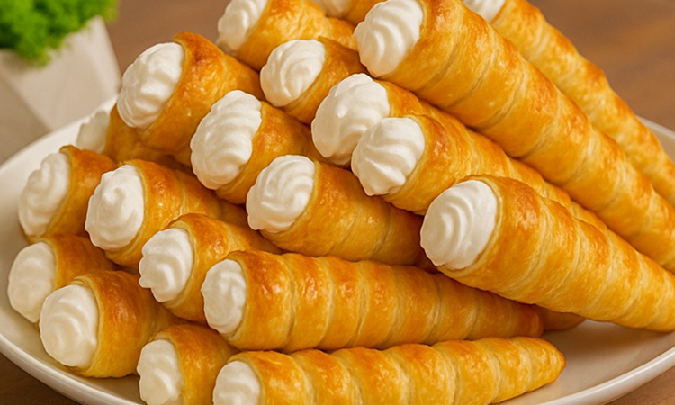 Смажьте заготовки желтком с молоком и выпекайте при температуре двести градусов около двадцати минут до золотистого цвета. Дайте трубочкам полностью остыть, снимите их с форм и плотно наполните белковым кремом с помощью кондитерского мешка.