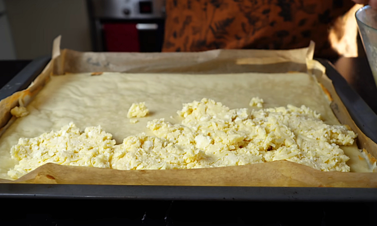 4. Достаньте форму из духовки, выложите сырную начинку поверх запечённого теста и равномерно распределите её ложкой. Верните хачапури в духовку ещё на 7 минут — за это время сыр расплавится, начинка станет кремовой, а края теста подрумянятся.