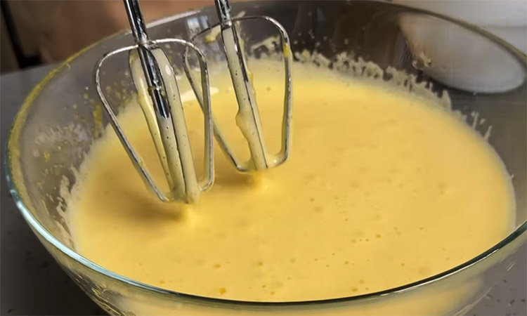 Разбейте яйца в миску, добавьте соль с сахаром и перемешайте венчиком или миксером до небольшого посветления массы. Влейте растительное масло без запаха и хорошо соедините компоненты, чтобы сахар начал растворяться. Просейте пшеничную муку в яичную смесь и замесите однородное густое тесто без комочков.