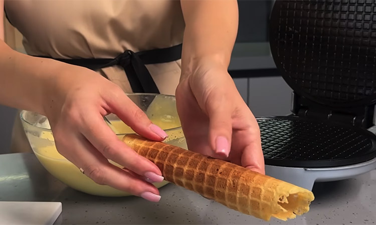 Постепенно вливайте молоко в три приема, каждый раз тщательно вымешивая массу до состояния текучей ленты. Смажьте разогретую вафельницу маслом только один раз и наливайте по столовой ложке теста, выпекая каждую вафлю около минуты до румяности. Сразу снимайте горячий блинчик и плотно скручивайте его в трубочку, пока он не застыл.
