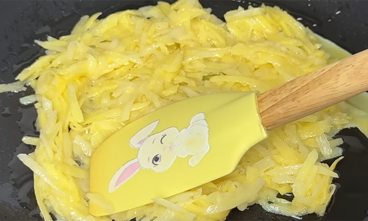 Очистите картофель и натрите его на крупной терке в глубокую миску. Разбейте одно яйцо, добавьте его к картофельной массе, посолите по вкусу и тщательно перемешайте все компоненты. Разогрейте сковороду на медленном огне, влейте немного растительного масла и выложите картофельную смесь.