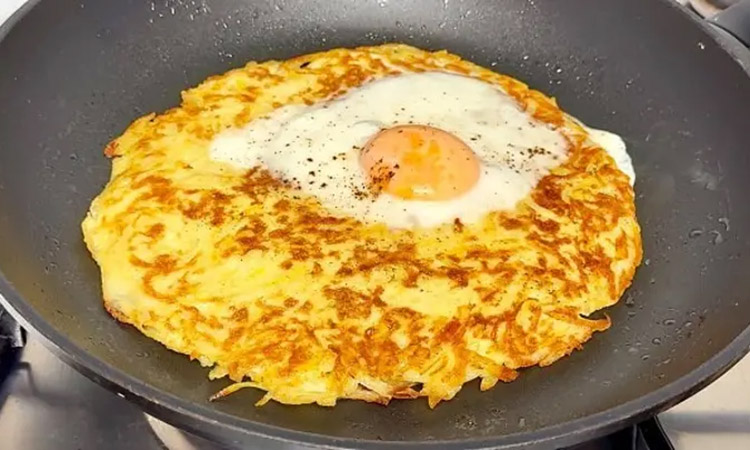 Сразу после этого разбейте второе яйцо прямо сверху на картофельную лепешку, стараясь не повредить желток. Посолите яйцо, добавьте немного черного перца и снова закройте сковороду крышкой на четыре-пять минут.