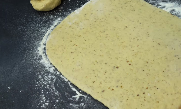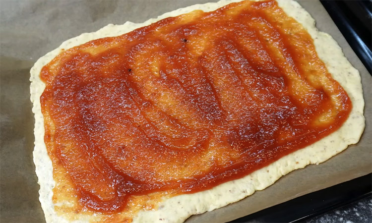 Уберите готовое тесто в холодильник на пятнадцать минут, чтобы оно немного стабилизировалось и стало удобнее в работе. Разделите охлажденное тесто на две равные части и раскатайте первую из них в прямоугольный пласт прямо на бумаге для выпечки. Равномерно смажьте поверхность теста густым вареньем или джемом, оставляя небольшие отступы от краев.