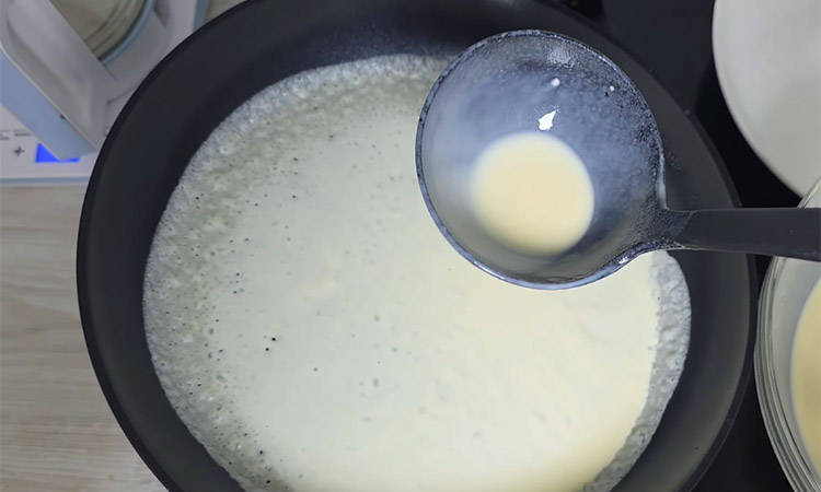 Выливайте тесто тонким слоем и жарьте на огне выше среднего до румяности краев, затем аккуратно переворачивайте лопаткой.