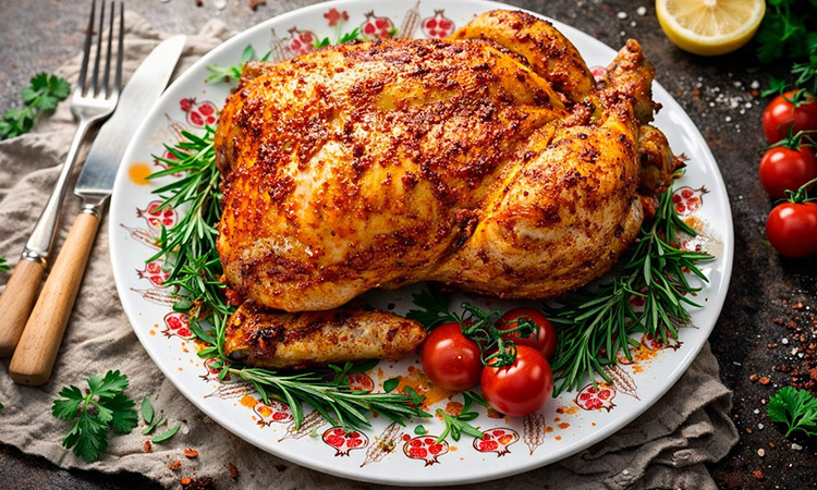 Тщательно натрите курицу полученной смесью снаружи и внутри, распределяя соус равномерным слоем. Поместите курицу в разогретую до 220 градусов духовку на 10 минут, затем убавьте температуру до 180 градусов и запекайте еще 25 минут. Каждые 10 минут доставайте противень и поливайте тушку вытопившимся жиром для получения идеальной корочки.