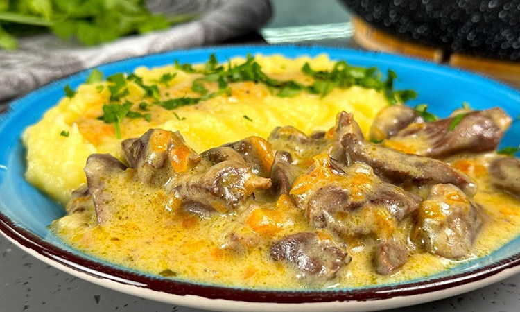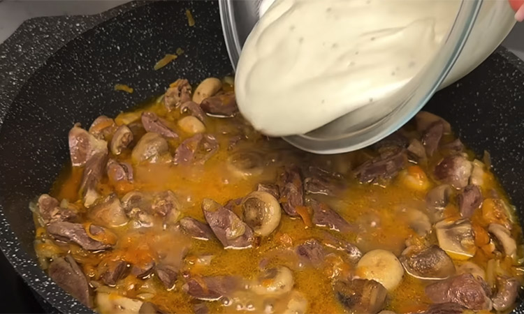 Субпродукты часто остаются недооцененными из-за своей плотной текстуры, но длительное томление в сметанной заливке делает их удивительно мягкими и сочными. Сочетание крупных индюшачьих сердечек с целыми мелкими шампиньонами создает интересное разнообразие форм и вкусов в одной тарелке. Насыщенный соус на основе сметаны и муки пропитывается ароматами обжаренного лука и чеснока, превращая обычные потрошки в изысканное основное блюдо. Нежная подливка идеально дополняет любой гарнир, будь то воздушное картофельное пюре, рассыпчатый рис или классическая гречка.