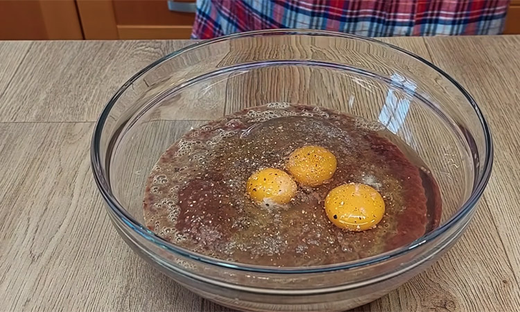 Пропустите говяжью печень с одной луковицей через мясорубку. Разбейте в фарш три яйца, всыпьте соль и перец, после чего тщательно перемешайте массу. Постепенно всыпьте муку, затем добавьте соду и снова перемешайте. Оставьте тесто на 10 минут.