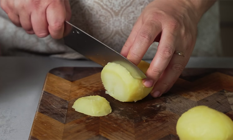 Возьмите большую миску, чтобы было удобно перемешивать продукты и не давить их. Нарежьте отварную морковь мелким кубиком, а картофель подготовьте кубиками среднего размера. Измельчите вареные яйца так, чтобы кусочки были примерно в два раза меньше картофеля. Нарежьте отварную говядину аккуратными кубиками того же размера, что и яйца.