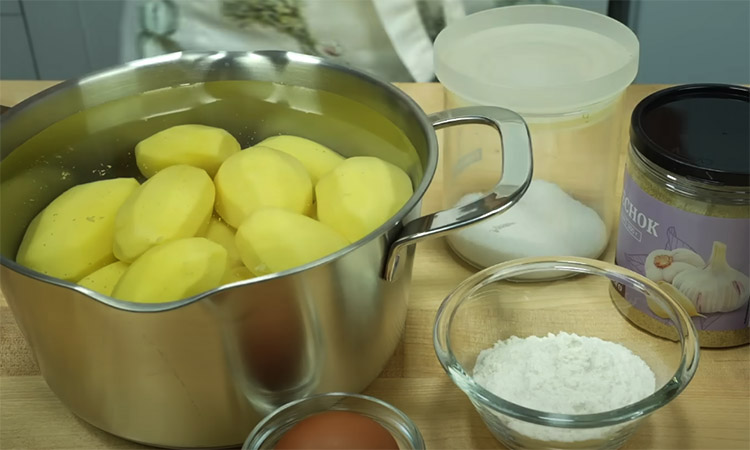 Очистите картофель от кожуры и отварите в несоленой воде до полной готовности. Слейте воду через дуршлаг, дайте лишней влаге полностью испариться, затем разомните картофель толкушкой в однородное пюре. Посолите остывшее пюре по вкусу, добавьте специи, разбейте в него яйцо и перемешайте. Всыпьте немного муки и замесите ложкой густое и пластичное тесто, которое должно слегка липнуть к рукам.