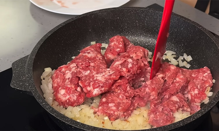 Для начинки обжарьте на сковороде мелко нарезанный лук до золотистого цвета, добавьте мясной фарш и готовьте, разбивая комочки. Посолите мясо, добавьте смесь перцев, сушеный чеснок и немного воды, затем потушите до выпарения жидкости, чтобы фарш остался сочным. Отдельно обжарьте нарезанные шампиньоны на сильном огне до румяности и соедините их с готовым мясным фаршем.