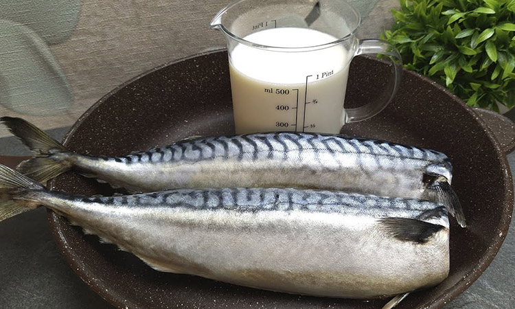 Накройте рыбу оставшимся луком, добавьте лавровый лист и еще немного подсолите слои при необходимости. Залейте содержимое жаровни молоком так, чтобы оно почти полностью покрывало верхний слой рыбы. Накройте посуду крышкой и томите на самом слабом огне около сорока минут до полной мягкости лука. Подавайте готовую скумбрию к столу в горячем виде, обильно поливая каждый кусочек образовавшимся нежным молочным соусом.