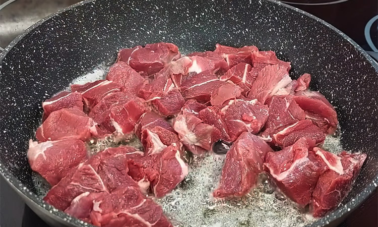 Перловую крупу заранее хорошо промойте и замочите в воде на ночь, чтобы она стала мягче. Нарежьте говядину небольшими кусочками и обжарьте на сильном огне в смеси растительного и сливочного масел до румяной корочки. Переложите обжаренное мясо в кастрюлю или сотейник с толстым дном, стараясь оставить жир в сковороде. В этой же сковороде обжарьте мелко нарезанный лук с чесноком, затем добавьте морковь и сельдерей, потушите всё вместе несколько минут.
