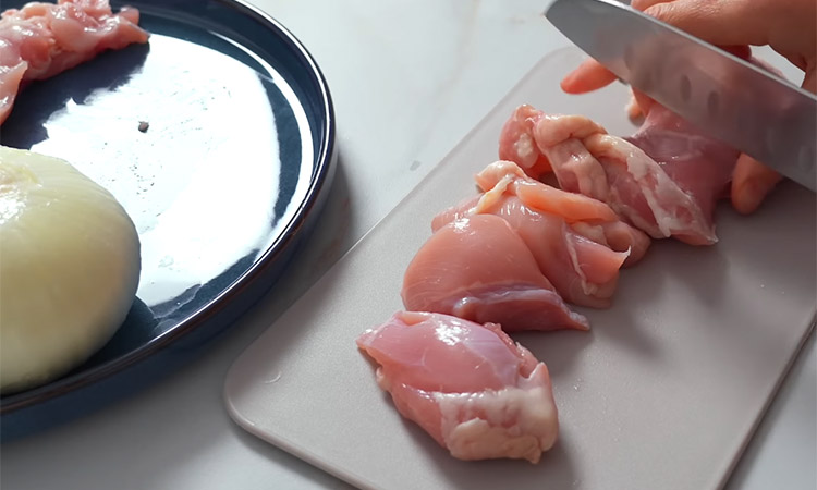 Пропустите куриное филе и лук через мясорубку или измельчите в блендере до состояния однородного фарша. Добавьте к мясу яйцо и греческий йогурт, затем тщательно перемешайте массу. Смешайте муку с содой и всыпьте в емкость к остальным ингредиентам, посолите и поперчите по вкусу.