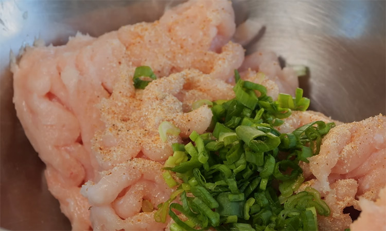 Положите ломтики хлеба в миску, залейте их сливками и оставьте на несколько минут, чтобы они полностью размякли. Тщательно разомните мокрый хлеб вилкой до состояния однородной кашицы. Смешайте куриный фарш с подготовленным хлебом, добавьте сухой чеснок и мелко нарезанный зеленый лук. Если используете сычуаньский перец, разотрите его в ступке и всыпьте в фарш вместе с солью и кунжутным маслом.