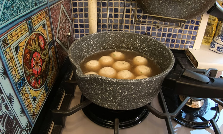Хорошо вымесите массу руками, чтобы все специи распределились равномерно. Налейте куриный бульон в кастрюлю и доведите его до кипения. Смочите руки водой и сформируйте из фарша ровные шарики размером чуть больше грецкого ореха. Аккуратно опускайте фрикадельки в кипящий бульон и варите их на небольшом огне около 7 минут.