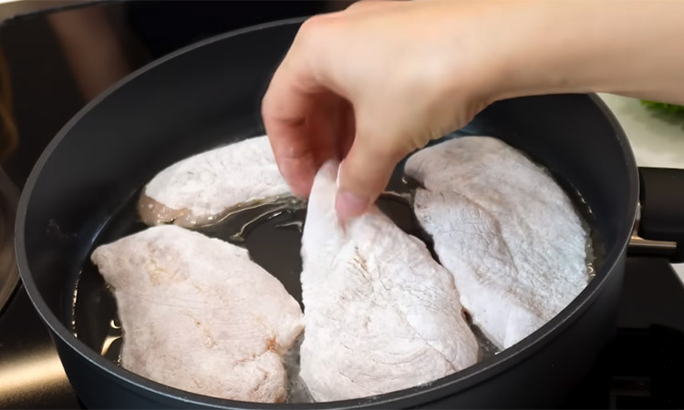 Разрежьте куриную грудку вдоль на две части и приправьте солью, сушеным чесноком и специями для курицы с обеих сторон. Оставьте мясо на несколько минут, затем тщательно обваляйте каждый кусок в муке. Разогрейте растительное масло в глубокой сковороде и быстро обжарьте филе на большом огне до образования золотистой корочки, чтобы запечатать сок внутри.