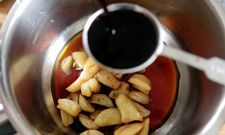 4. Переложите чеснок в чистый сотейник. Добавьте 2 столовые ложки воды и столько же соевого соуса. Влейте столовую ложку кленового сиропа, чтобы чеснок приобрел карамельную нотку. Готовьте смесь на маленьком огне, помешивая, пока соус не загустеет и чеснок не станет мягким, блестящим и слегка карамелизированным. Обычно это занимает 10–15 минут.