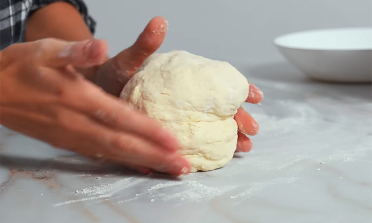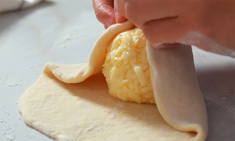 Для начинки натрите сулугуни на крупной терке, смешайте со вторым яйцом и сформируйте из полученной массы четыре плотных шарика. Разделите отдохнувшее тесто на четыре равные части, каждую из которых округлите и раскатайте в небольшой тонкий круг на присыпанной мукой поверхности. Поместите сырный шарик в центр каждой заготовки, плотно соберите края теста сверху в узелок и аккуратно прижмите ладонью.