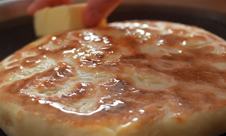 Раскатайте получившийся мешочек скалкой в плоскую лепешку по диаметру вашей сковороды, действуя плавно, чтобы не порвать тесто. Выложите хачапури на сухую разогретую сковороду и обжаривайте на среднем или медленном огне примерно по пять минут с каждой стороны. Готовую горячую лепешку сразу переложите на тарелку и обильно смажьте сливочным маслом, пока она еще выделяет пар.