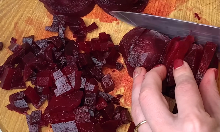 2. Отварную свеклу очистите от кожуры и нарежьте небольшими аккуратными кубиками примерно одинакового размера — так салат будет выглядеть более аппетитно и равномерно пропитается заправкой. Добавьте свеклу к кукурузе.