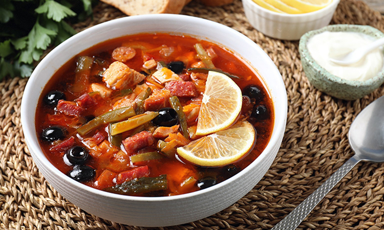 Солянка объединяет в одной кастрюле разные виды мяса и колбас, создавая сложный, но гармоничный вкус. Основа из бульона и томатной пасты придает супу насыщенный цвет и глубину. Соленые огурцы и маслины добавляют характерную кислинку, без которой блюдо теряет свой стиль. В результате получается сытный суп с выразительным ароматом и крепким бульоном — варится он с правильным рецептом совсем несложно.