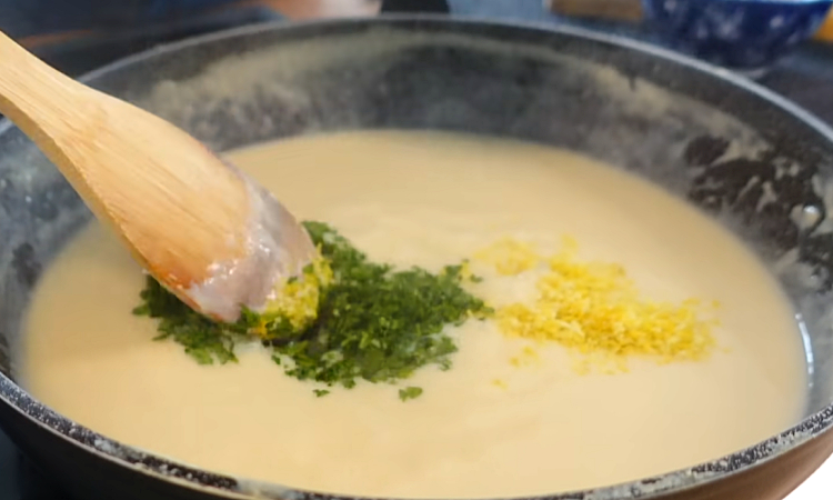 2. Влейте молоко небольшими порциями, продолжая размешивать, чтобы не образовались комки. Сначала влейте половину, дождитесь, пока масса немного загустеет, затем добавьте оставшееся молоко. Соус постепенно станет кремовым и однородным. Когда молочный соус немного уварится, влейте белое вино. Оно добавит лёгкую фруктовую кислинку и средиземноморскую свежесть. Сразу же добавьте цедру лимона и мелко нарезанную петрушку — они придадут блюду яркость и аромат. Посолите и поперчите по вкусу, тщательно размешивая.