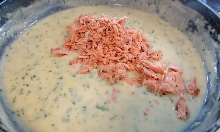 3. Добавьте в соус консервированного тунца, предварительно слив жидкость, и аккуратно перемешайте, чтобы крупные кусочки тунца остались целыми. Уменьшите огонь до минимума — соус должен лишь слегка «трепыхаться», а не кипеть, чтобы сохранить нежность тунца.