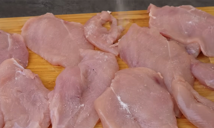 Промойте рис до прозрачной воды, дайте лишней жидкости полностью стечь. Переложите рис в толстостенную кастрюлю, залейте тремя стаканами воды, добавьте соль и поставьте на плиту. Доведите до кипения на сильном огне и проварите 3–4 минуты, затем выключите нагрев и плотно закройте крышкой. Не открывайте крышку и дайте рису дойти самостоятельно, пока готовится основное блюдо. После выдержки аккуратно перемешайте, при необходимости слейте остатки воды и по желанию добавьте немного сливочного масла. Куриную грудку разрежьте вдоль на две части, чтобы получились более тонкие пласты.