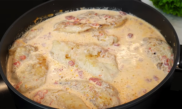 Влейте сливки, добавьте соль и черный перец по вкусу, доведите до легкого кипения и уменьшите огонь. Верните курицу в соус, накройте крышкой и тушите 15 минут на небольшом огне.