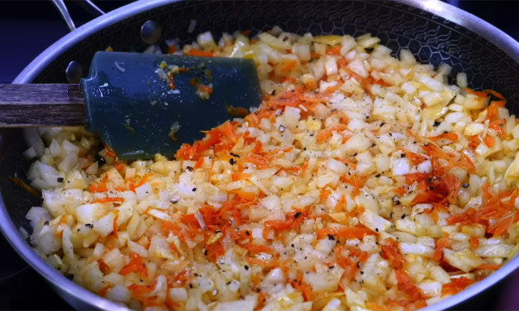 Начните с подготовки овощной основы, натерев морковь на крупной терке и мелко нарезав лук кубиками. Разогрейте сковороду с маслом и сначала пассеруйте морковь до мягкости, затем добавьте к ней лук и готовьте овощи на среднем огне до легкого золотистого цвета, не забыв посолить и поперчить. Половину готовых овощей отложите для соуса, а вторую часть используйте для фарша.