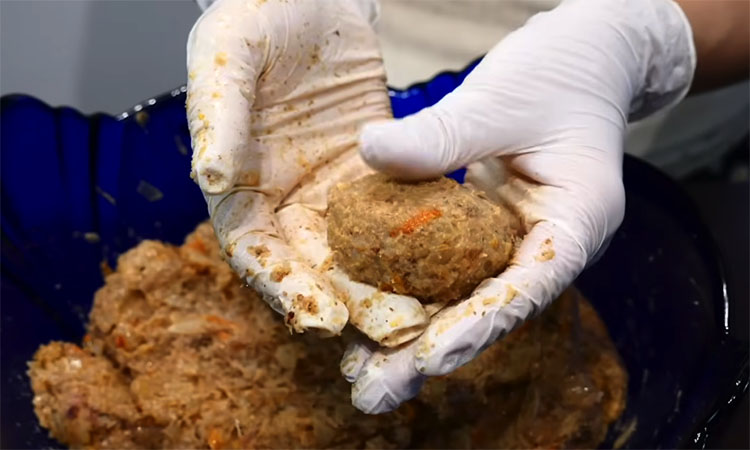 Приготовьте мясную основу, измельчив куриное мясо в мясорубке или блендере, после чего смешайте его с отварной гречкой и вбейте одно egg. Добавьте к фаршу часть обжаренных овощей, сушеный укроп, немного горчицы и панировочные сухари для вязкости, тщательно вымешав массу руками до однородности.