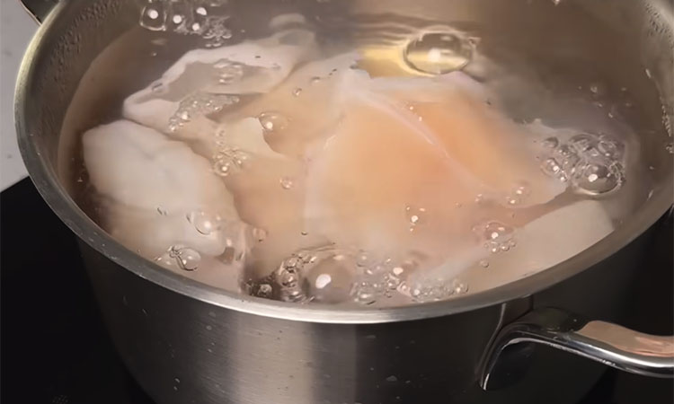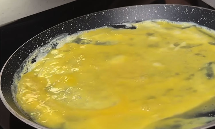 Начните с приготовления кальмаров, опустив их в кипящую подсоленную воду ровно на одну минуту. Сразу откиньте морепродукты на дуршлаг и обдайте холодной водой, после чего нарежьте их тонкими полосками или кольцами. Для яичных блинчиков взболтайте яйца со щепоткой соли и поджарьте на смазанной маслом сковороде два тонких блина.